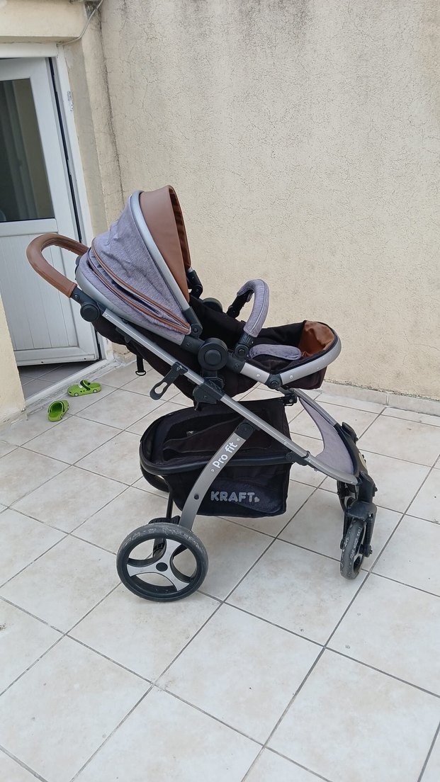 Gri Kraft bebek arabası, sağlam iskelet, ayarlanabilir tente ve kullanışlı saklama sepeti ile. Rahat oturma alanı ve güvenlik kemeri bulunur. Az kullanılmış temiz