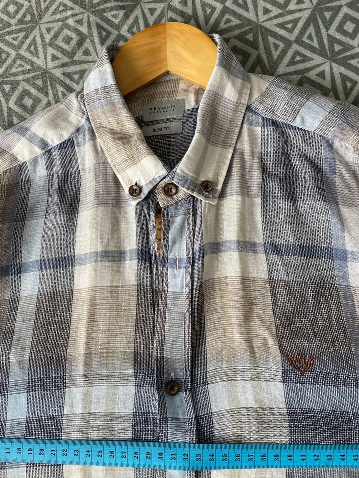 Düğmeli, yakalı ve uzun kollu erkek gömlek, yumuşak keten kumaştan üretilmiş. Gri krem mavi ekose deseni ve regular fit kesimiyle günlük rahat kullanıma uygundur.