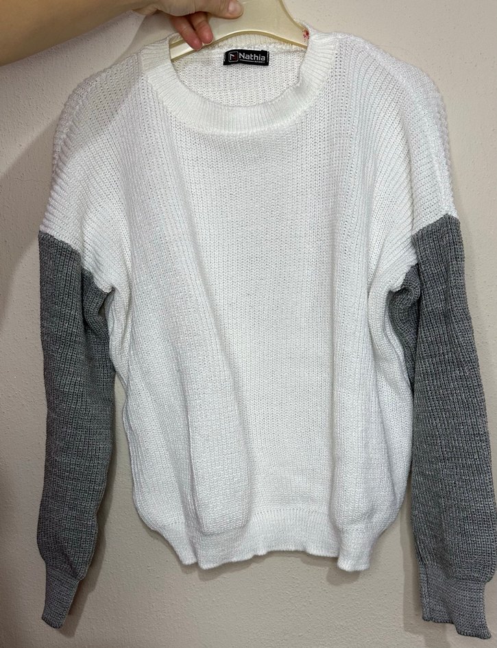 Bu kadın sweatshirtü, triko dokusu, yuvarlak yaka ve uzun kollara sahiptir. Gri ve krem renklerin birleşimiyle rahat, salaş ve midi boyda, günlük kullanıma uygundur.