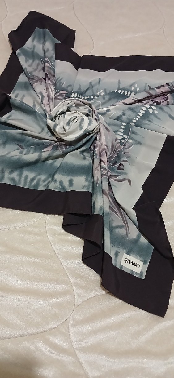 Gri renkte, krep dokulu ve drapeli tasarıma sahip kadın eşarp. 'VAKKO' marka etiketi bulunur. ️