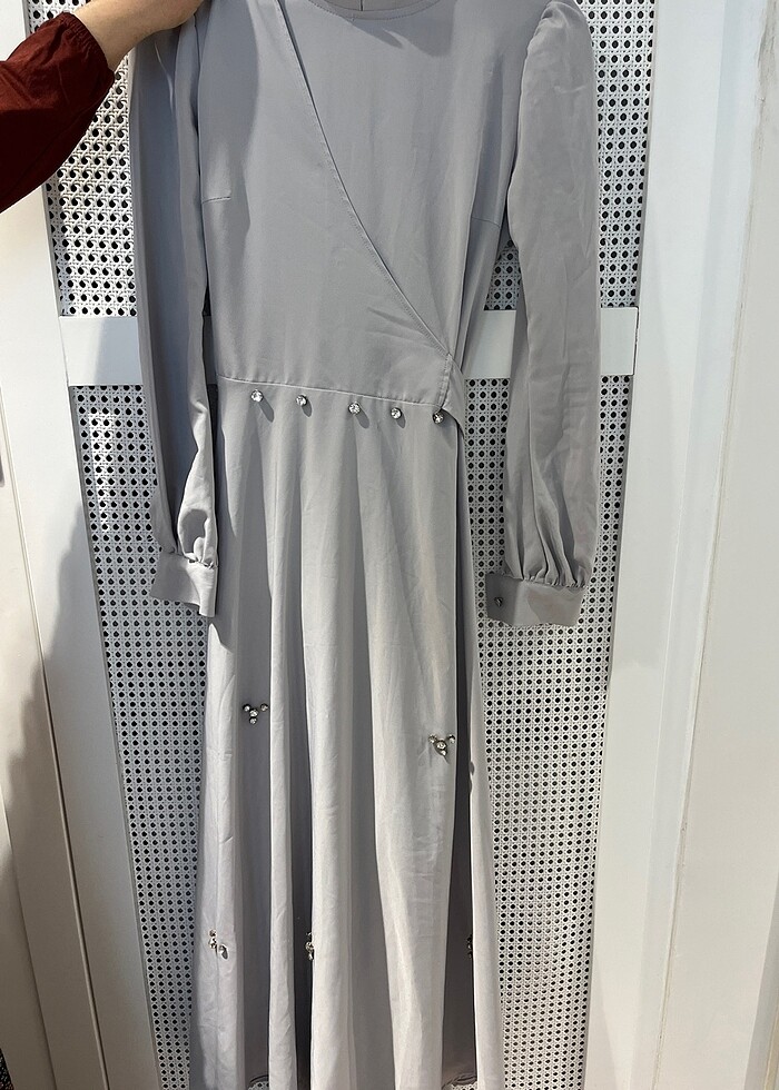 GRİ KREP KLOŞ ABİYE. 36-38 Bedendir bir kere mezuniyette giydim. Üstünde taş detaylar var. Önü uzun arkası kısa modeldir. Benim boyum 1.62 ona göre kıyaslayabilirsiniz