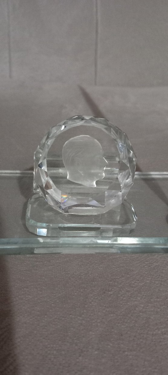 Gri renkte, faset kesimli yuvarlak çerçeve içinde kabartma Atatürk profil bulunan kristal figürin, dikdörtgen taban üzerinde duruyor. ✨