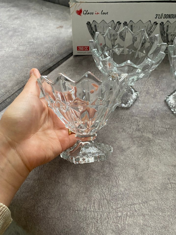 Gri Kristal Ayaklı Cam Kase 3'lü Set dondurma tatlı kasesi