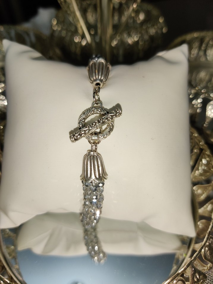 Boncuklu tasarıma sahip, gri kristal desenli kadın bileklik. Düğün için uygun, çağdaş tarzda, klasik zarafeti yansıtır.