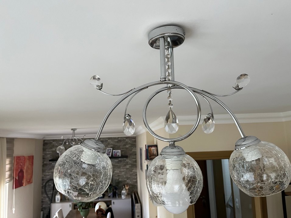 2 adet. cam küreler ve gri metal çerçeveli, kristal süslemeli tavan avizesi. Her odaya şık bir dokunuş katıyor.