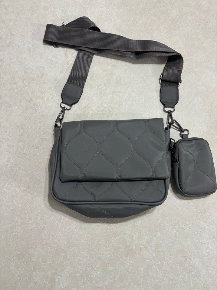 Gri renkte, kemerli ve çıkarılabilir küçük cüzdanlı kadın çantası. Sentetik kumaştan, günlük sokak stiline uygun.