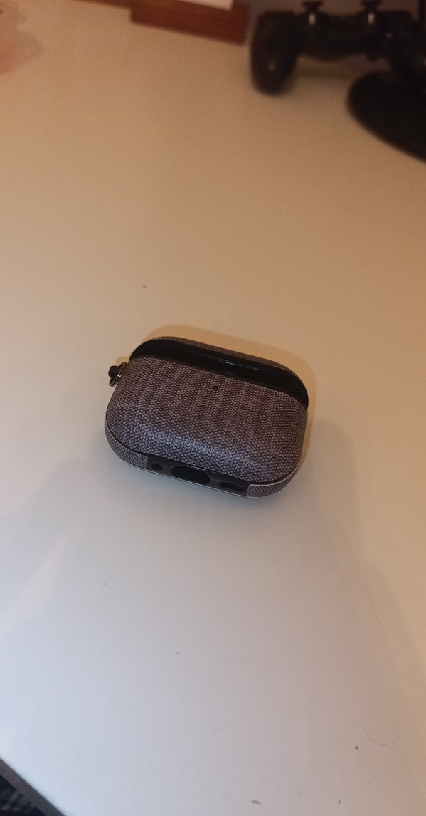 airpods pro 3 gri renklerde, dokulu yüzeye sahip kulaklık taşıma kutusu, koruma ve kolay taşınabilirlik sağlar.