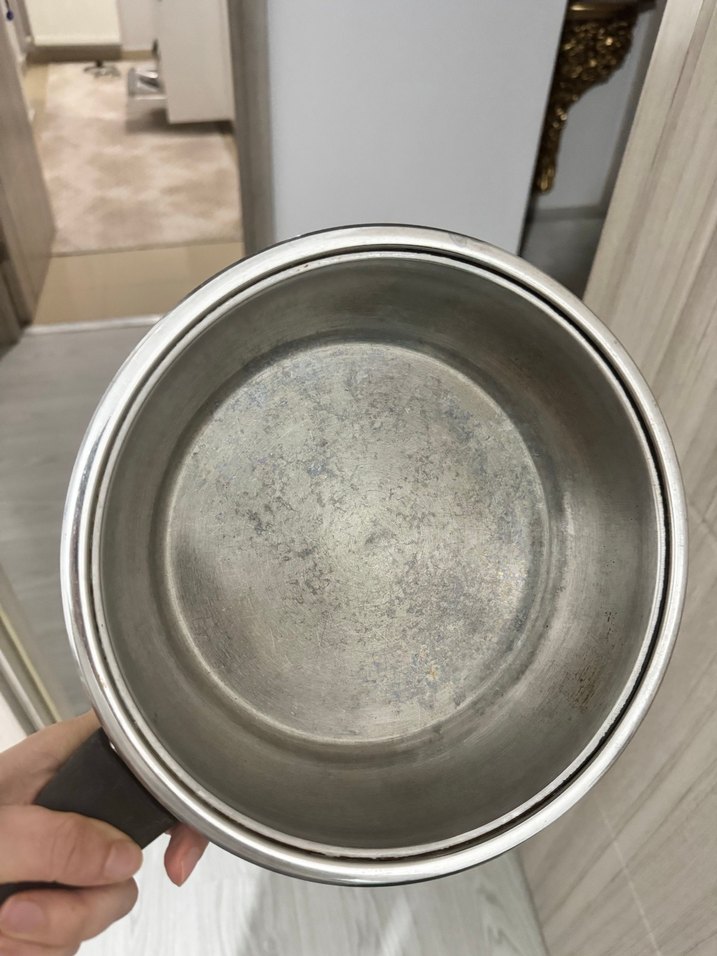 Gri kulplu, metal iç yüzeyli bej renk tava , günlük yemek pişirme için uygundur.