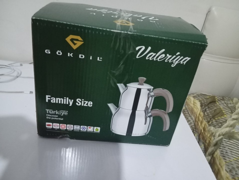 Ökdil markasına ait, gri kulplu beyaz çaydanlık takımı. Aile boyu kapasiteye sahip, paslanmaz çelikten yapılmıştır. ☕️