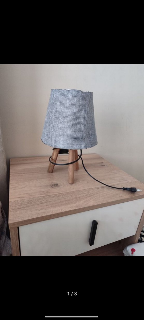 Gri kumaş başlıklı ve ahşap üç ayaklı masa lambası, doğal ve sade bir görünüm sunar. Siyah kablolu ve ampulü mevcuttur.