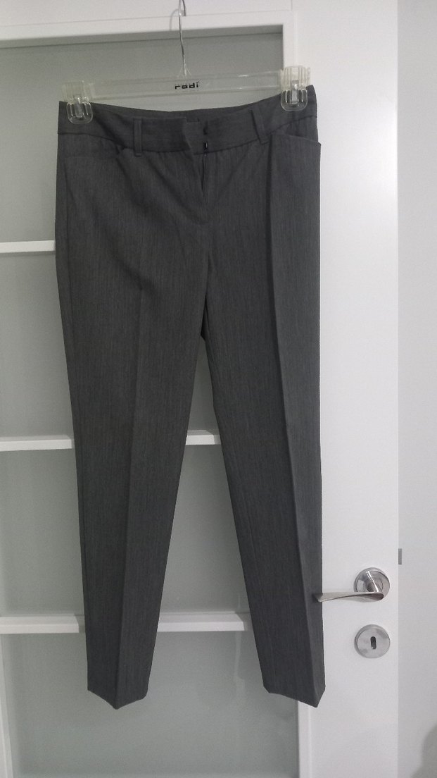 Gri renkte, kemerli ve normal boyda kadın kumaş pantolon. Ofis için uygun, düz ve desen içermeyen sade tasarım.