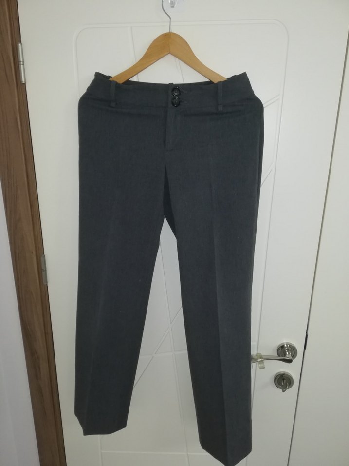 Gri denim kumaştan, normal boy ve regular fit kadın pantolon. Kemerli bel ve sade desensiz tasarıma sahip, ofis kullanımı için uygundur.