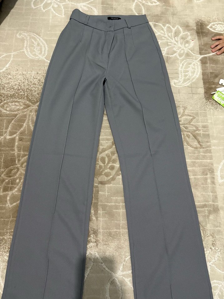 Gri uzun boy, düz desenli kadın pantolon, rahat kesimi ve yumuşak sentetik kumaşıyla ofis için şık ve rahat bir seçenek sunar.