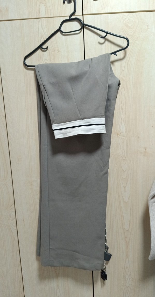 Gri kadın pantolon, düz kesim ve kemerli. Yumuşak sentetik.