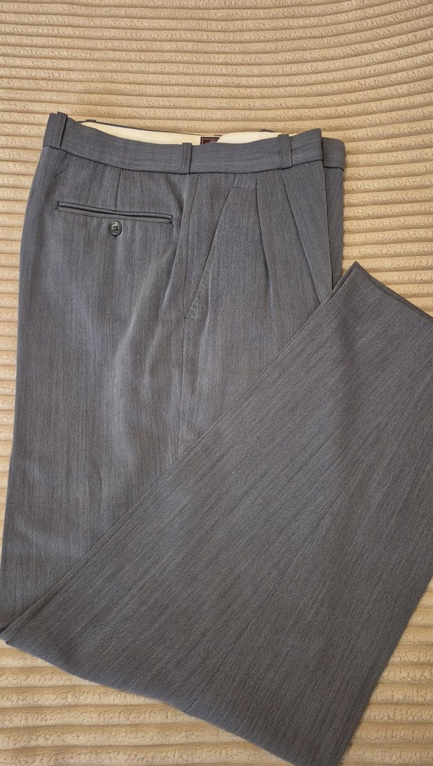 Gri renkte keten kumaştan, pilili ve normal boyda erkek pantolon. İş ortamı için uygun, klasik ve sade bir tarza sahiptir. 48 beden,sorunsuzdur.