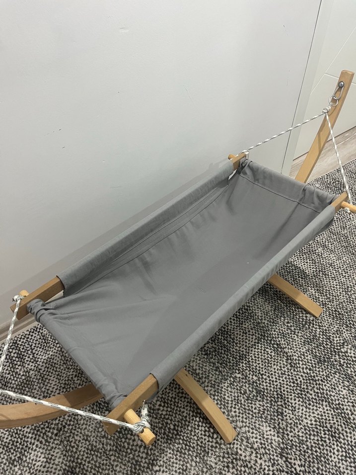 Ahşap çerçeveli ve gri kumaştan yapılmış, nazik sallanma için tasarlanmış bebek beşiği. ️