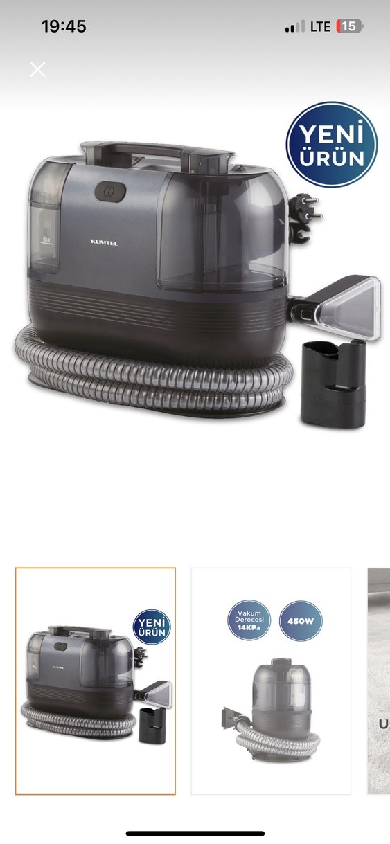 Gri Kumtel vakumlu temizlik cihazı, 450W motor ve 14KPa emiş gücü ile kompakt tasarıma sahiptir. Esnek hortum ve farklı başlıklar içerir.