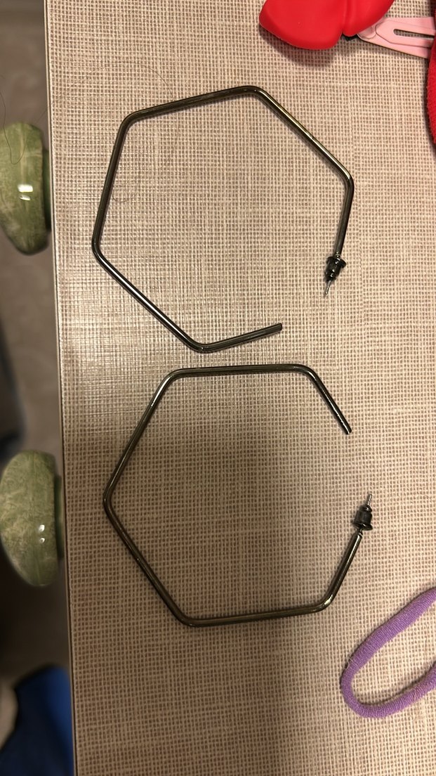 Gri renkte, altıgen midi uzunluğunda, minimalist ve avant-garde tarzda günlük kullanıma uygun küpeler. Adet 50 tl dir 3.fotoğraftaki uzun yıldızlı kolye en son fotoğraftaki yüzüklerde de adet 50 tldir