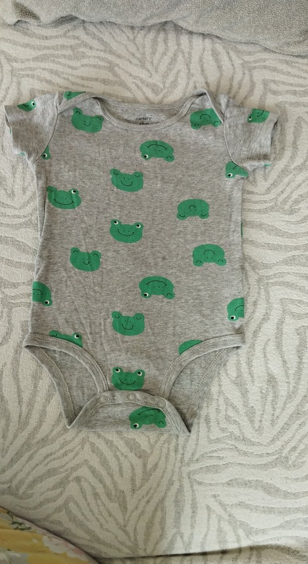 Kısa kollu, düğmeli, gri kurbağa desenli bebek body. Yumuşak kumaştan rahat kullanım sağlar.