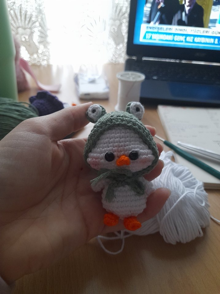 Yumuşak iplikle el yapımı gri amigurumi peluş oyuncak, kurbağa temalı kapşonlu küçük bir kuş figürüne sahiptir. Turuncu ayakları ve sevimli ifadesi bulunur.