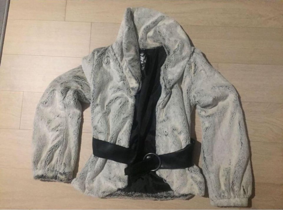 Gri kürk detaylı, uzun kollu, yumuşak kumaştan yapılmış, normal boy midi kesim, siyah kemerli ve fit kesim kadın ceket.