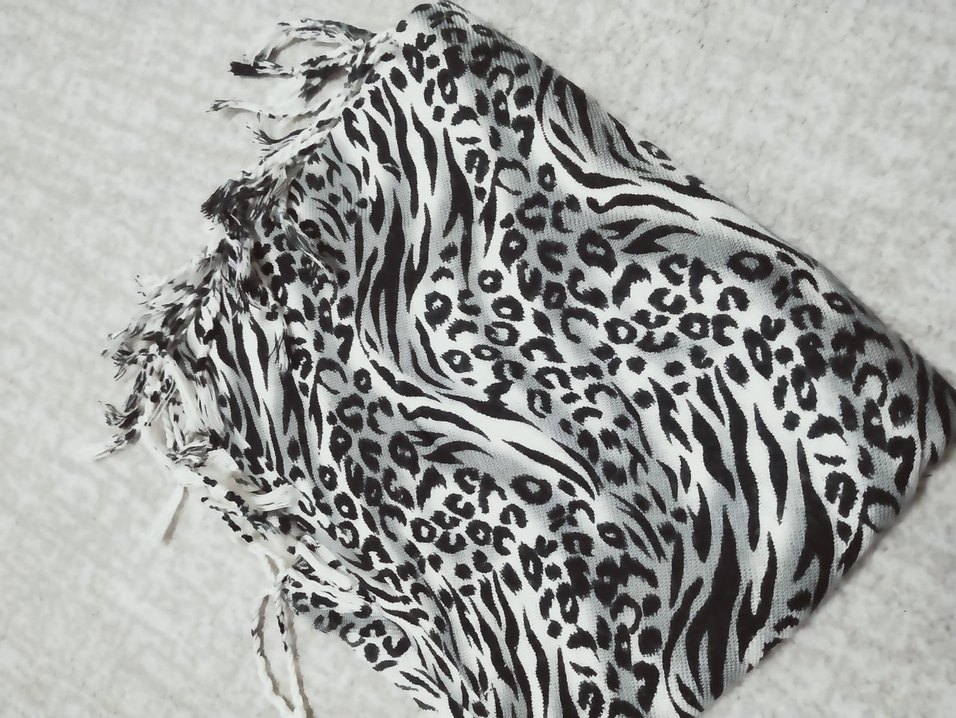 Gri hayvan desenli, kürk detaylı ve püsküllü kadın şalı, yumuşak sentetik kumaştan üretilmiştir. Bohem ve rahat tarzlara uygundur.