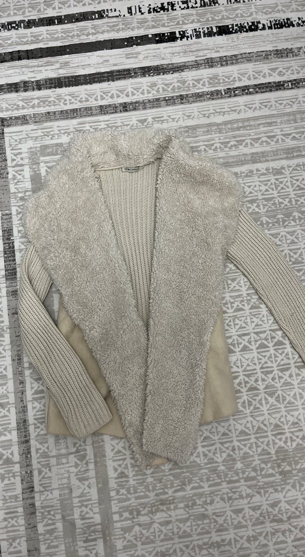 Gri triko hırka, uzun kollu ve kürk detaylı yakasıyla bohem ve rahat bir tarz sunar, günlük kullanım için uygundur.