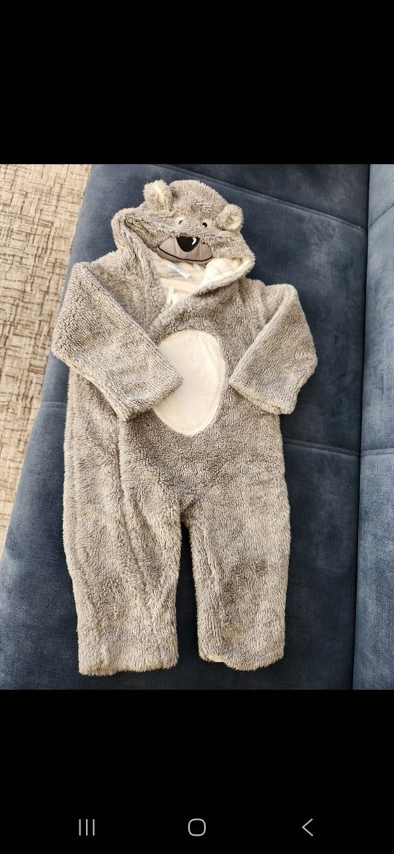 Gri renkte, yumuşak ve sıcak kumaştan üretilmiş, kapüşonunda ayı figürü bulunan kürklü bebek erkek tulumu. yurt dışından alınmıştır Sadece bir sefer giyildi marka temsilidir l