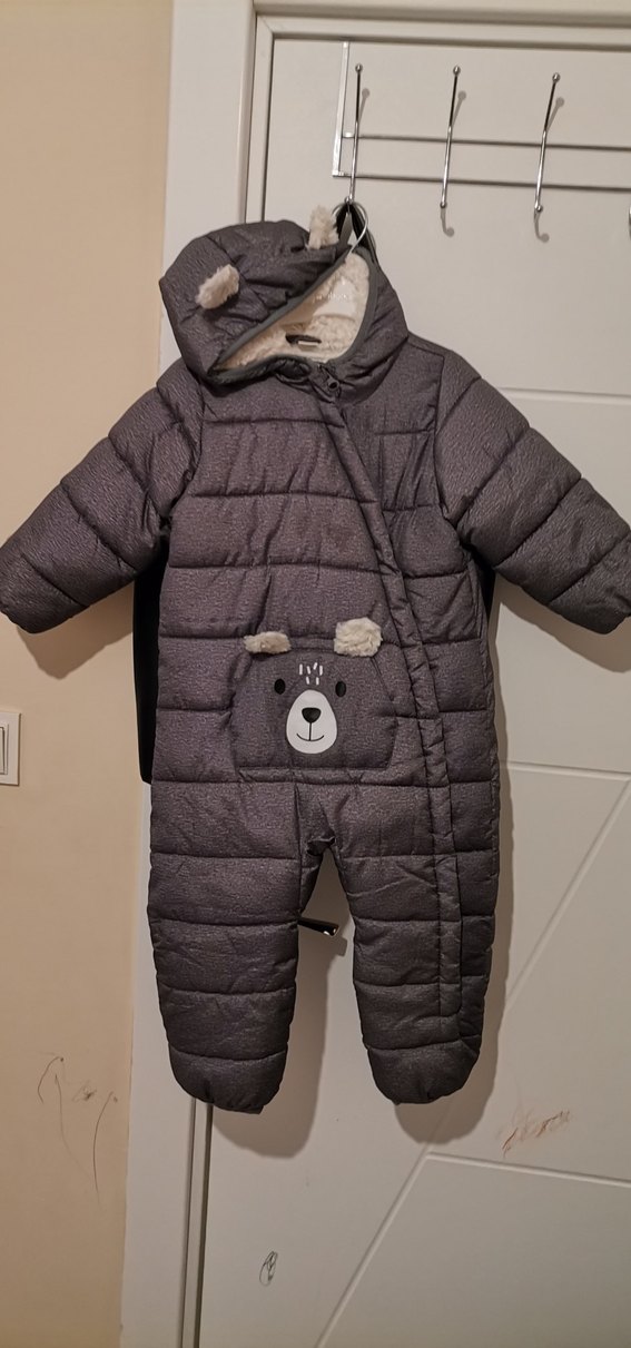 Gri renkli, yumuşak ve sıcak kumaştan yapılmış, kürk detaylı ve önünde sevimli ayı figürü bulunan bebek erkek tulumu. ❄️