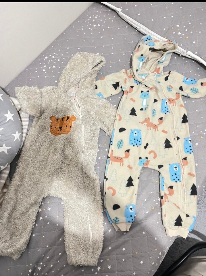 Gri renkte, yumuşak ve sıcak kumaştan yapılmış, kapüşonlu ve kürklü detaylara sahip bebek kayak tulumu. Leopar desenlidir ve sokak stili için uygundur. ❄️