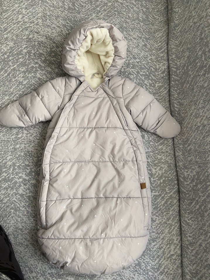 Gri renkli, kürklü detaylı bebek kış tulumu. Yumuşak ve sıcak kumaştan. ❄️