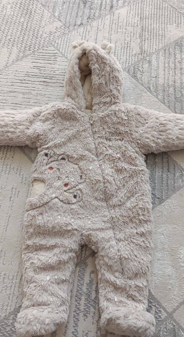 Kürklü detaylı, kapüşonlu, nakışlı gri bebek kış tulumu, yumuşak ve sıcak tutar.