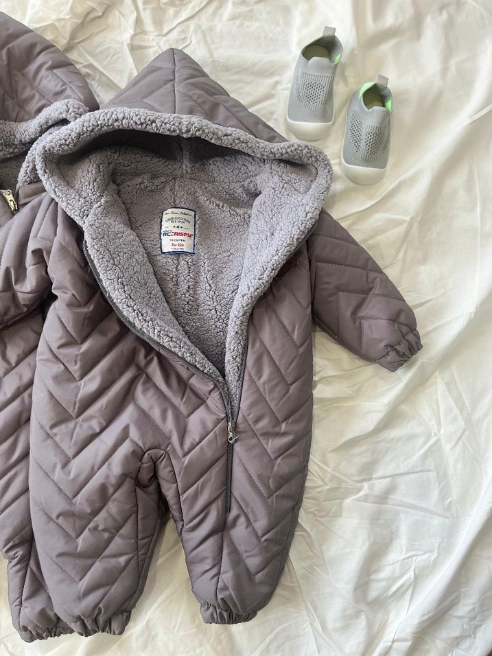 Gri renkte, yumuşak ve sıcak kürklü astarlı bebek kozmonot. Desensiz, rahat normcore tarzı ile tasarlanmıştır. 9