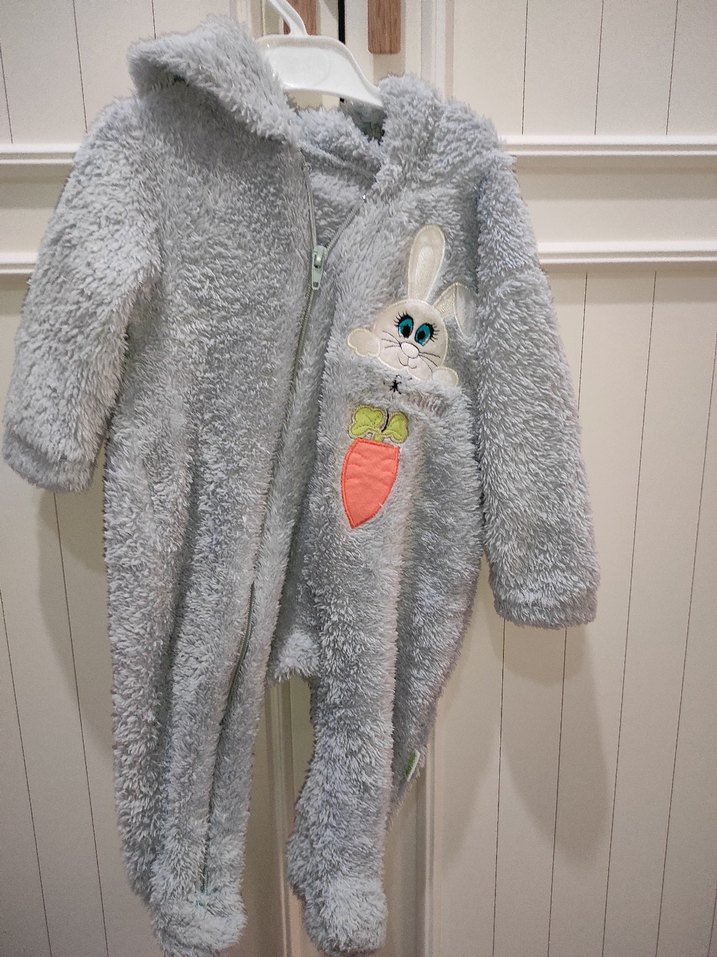 Gri renkli, yumuşak ve sıcak kumaştan yapılmış, kürklü detaylı bebek tulumu. Nakışlı tavşan ve havuç deseni bulunur, kapüşonlu ve fermuarlıdır. ❄️ 6-9 uyumlu. temiz durumda