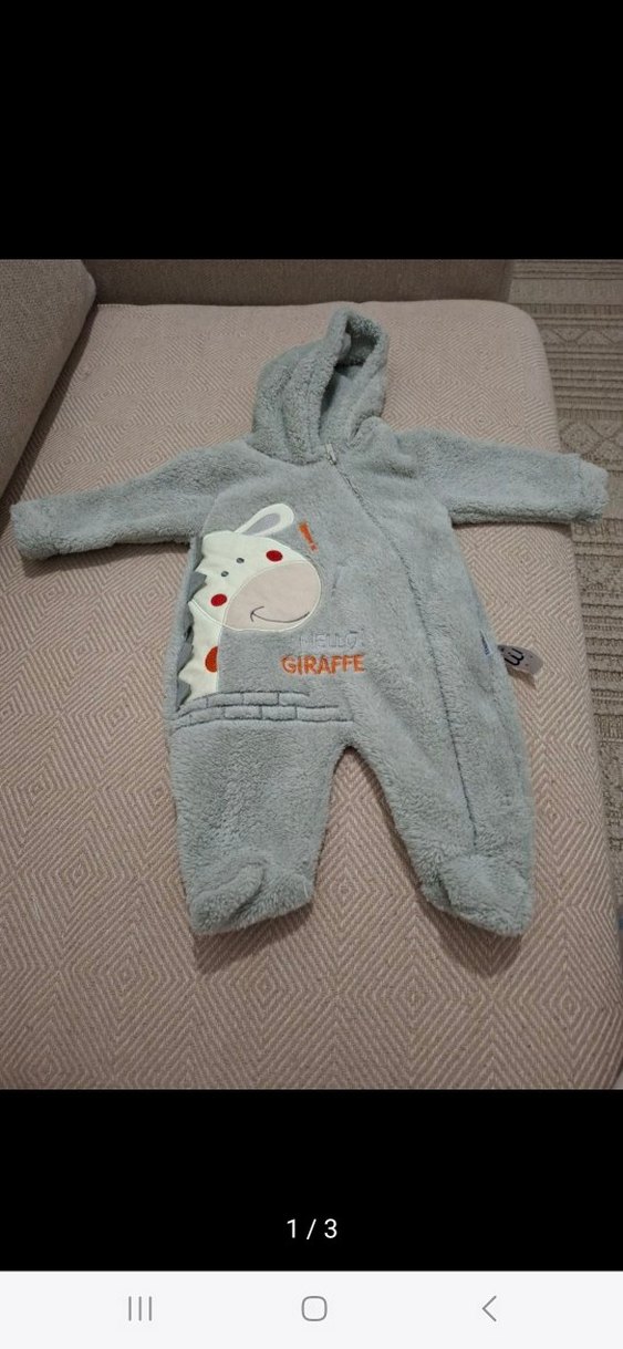 Gri renk, yumuşak ve sıcak kumaştan yapılmış kapüşonlu erkek bebek tulumu. Zürafa desenli ve kürk detaylıdır. hiç kullanmadım