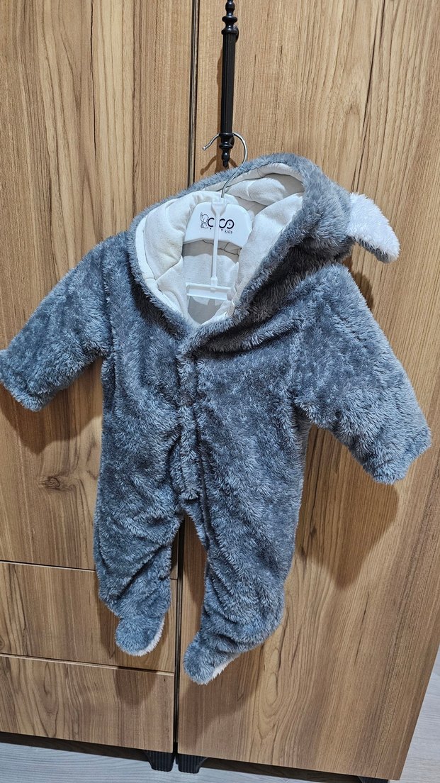 elyaf dolgulu Gri renkli, kürk detaylı yumuşak ve sıcak bebek tulumu. Kapüşonlu ve soğuk havalar için tam koruma sağlar. ❄️