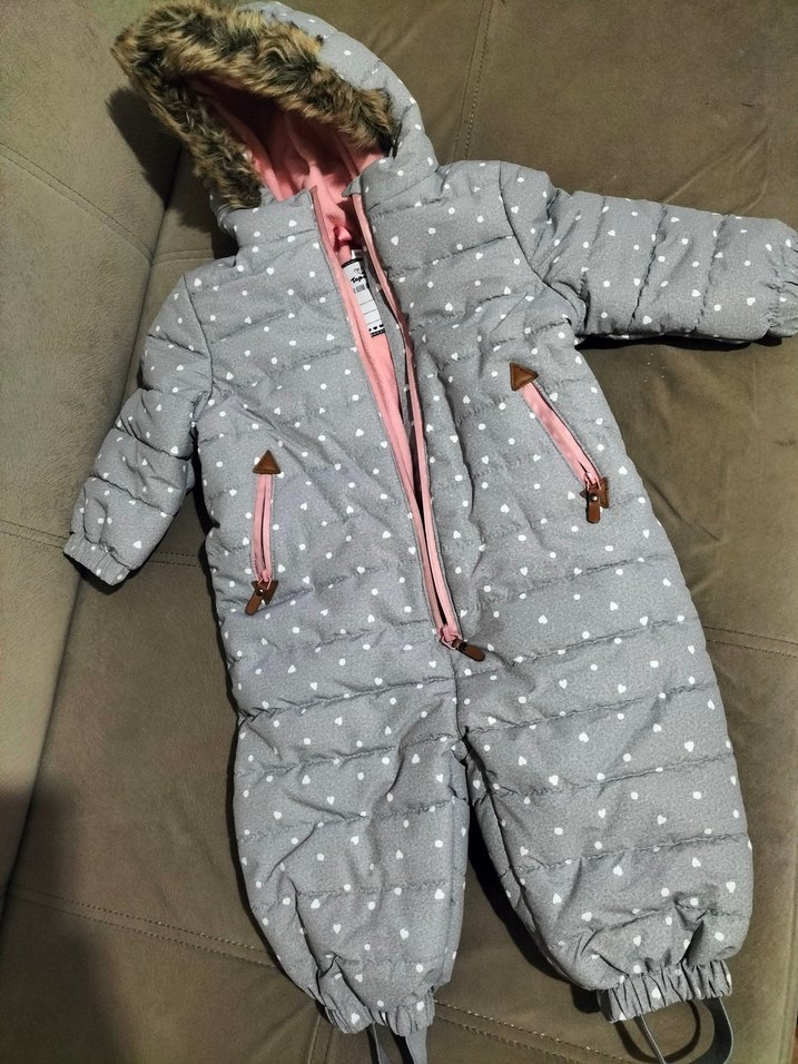 Gri, kürklü kapüşonlu bebek tulumu, notched lapel yakaya sahip. Yumuşak, sıcak kumaş ve hafif benekli desenle elastik manşetler içerir. ❄️Su tutmaz.İçi polar.