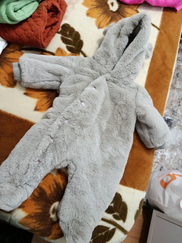 Gri renkte, yumuşak ve sıcak kumaştan yapılmış, kürk detaylı bebek tulumu. Kapüşonlu ve uzun kolludur, desensiz ve sade tasarıma sahiptir. ❄️