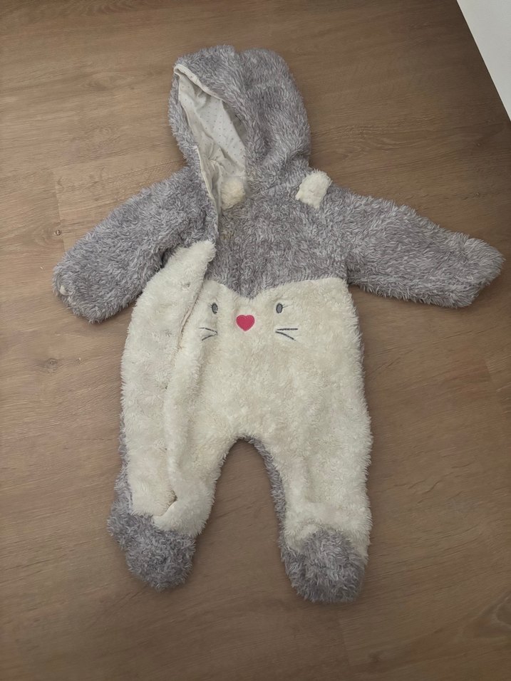 Gri renkli, kapüşonlu ve ayaklı bebek tulumu, yumuşak kürk detayları ve sevimli yüz desenine sahiptir. Soğuk havalar için sıcak tutar. ❄️