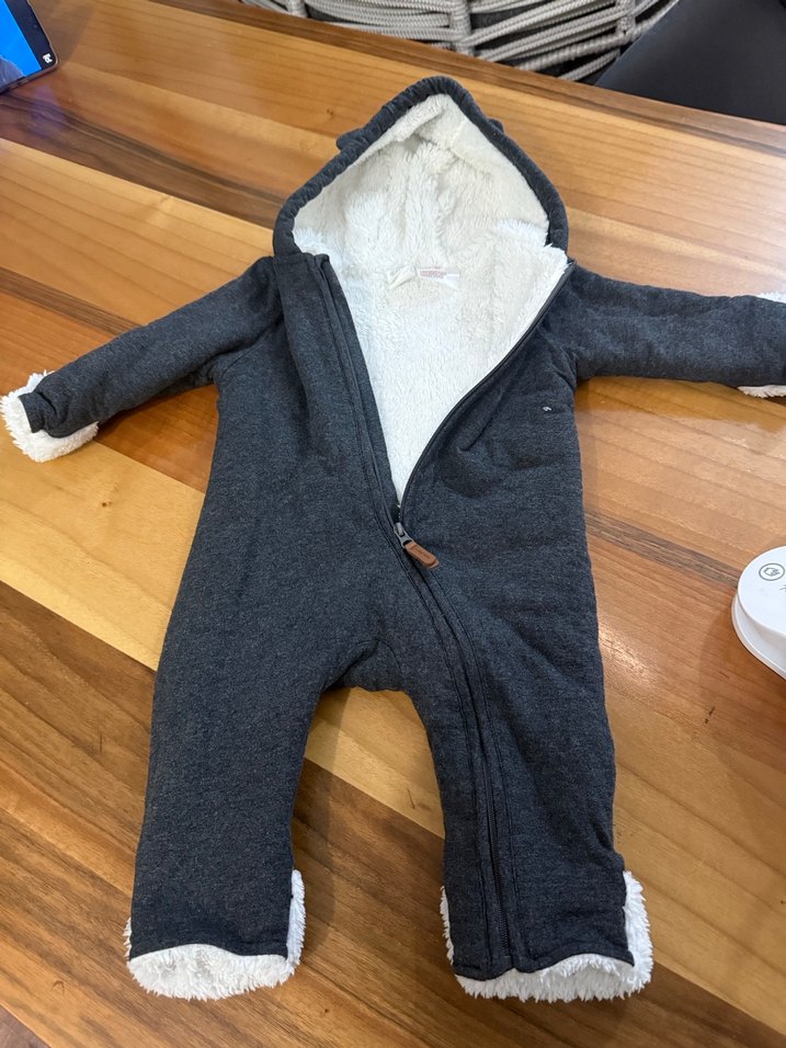 Gri renkli, yumuşak ve sıcak kumaştan yapılmış bebek tulumu. Kapüşon ve manşetlerde kürk detayları bulunur. Normcore tarzında, desensiz tasarım. ❄️