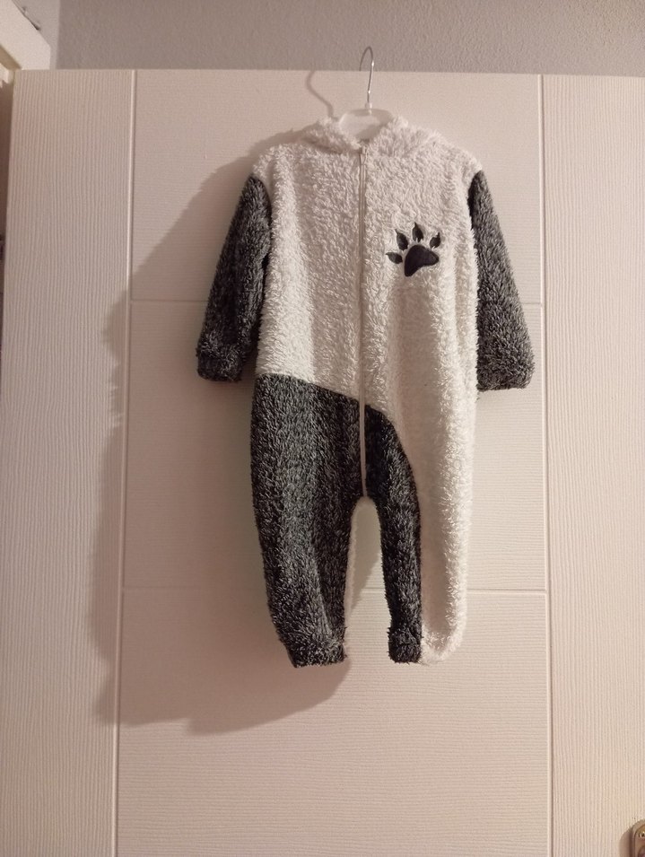Yumuşak ve sıcak kumaştan, kürklü detaylı gri bebek tulumu. Desensiz sade tasarım ve pati baskısı bulunur.