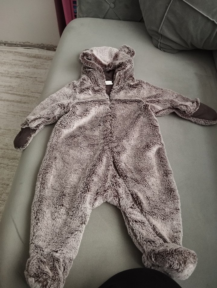 kahverengi renkte, kapüşonlu ve kürklü detaylı, ayaklı yumuşak bebek tulumu. 4-6 ay