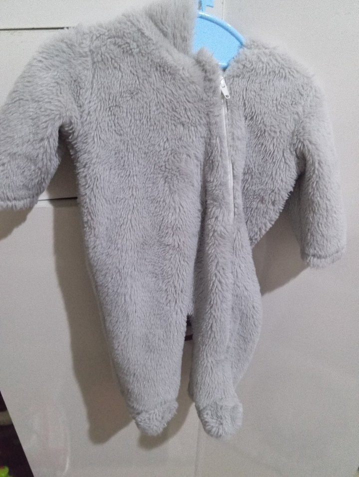 Gri renkte, yumuşak ve sıcak kumaştan yapılmış, kürk detaylı bebek tulumu. Fermuarlı kapanışı vardır.