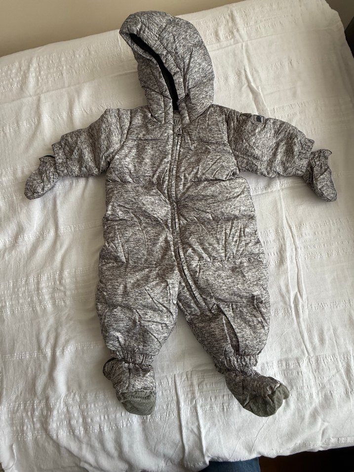 Gri renkli, kapüşonlu ve kürklü detaylı erkek bebek kayak tulumu. Yumuşak ve sıcak kumaştan, eller ve ayaklar kapalıdır. ❄️