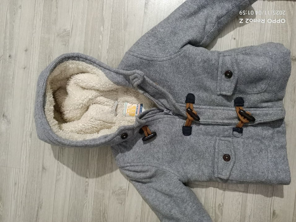 Gri renkli, kürklü iç astarlı, normal kesim ve baskılı detaylara sahip erkek çocuk montu. Düğmeli tokalı kapanışı vardır.