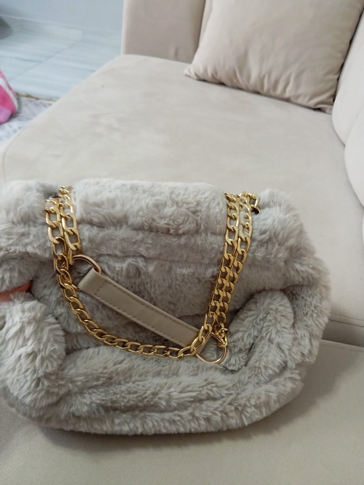 Kadın çantası, yumuşak ve sıcak kumaş üzerine kürk detaylıdır. Altın zincir askısı ve gri rengiyle gündelik kullanıma uygundur.