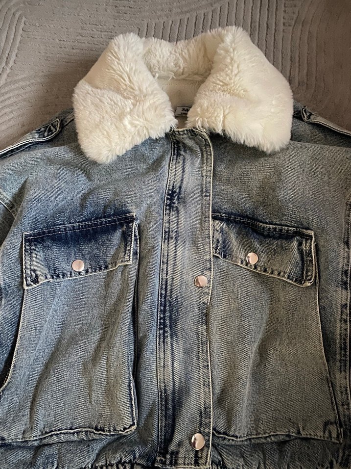 Yumuşak kürklü yakası, bol kesimi ve uzun kollu gri denim ceket. Ön cepler ve yakalı tasarımıyla rahat sokak stili için uygun.