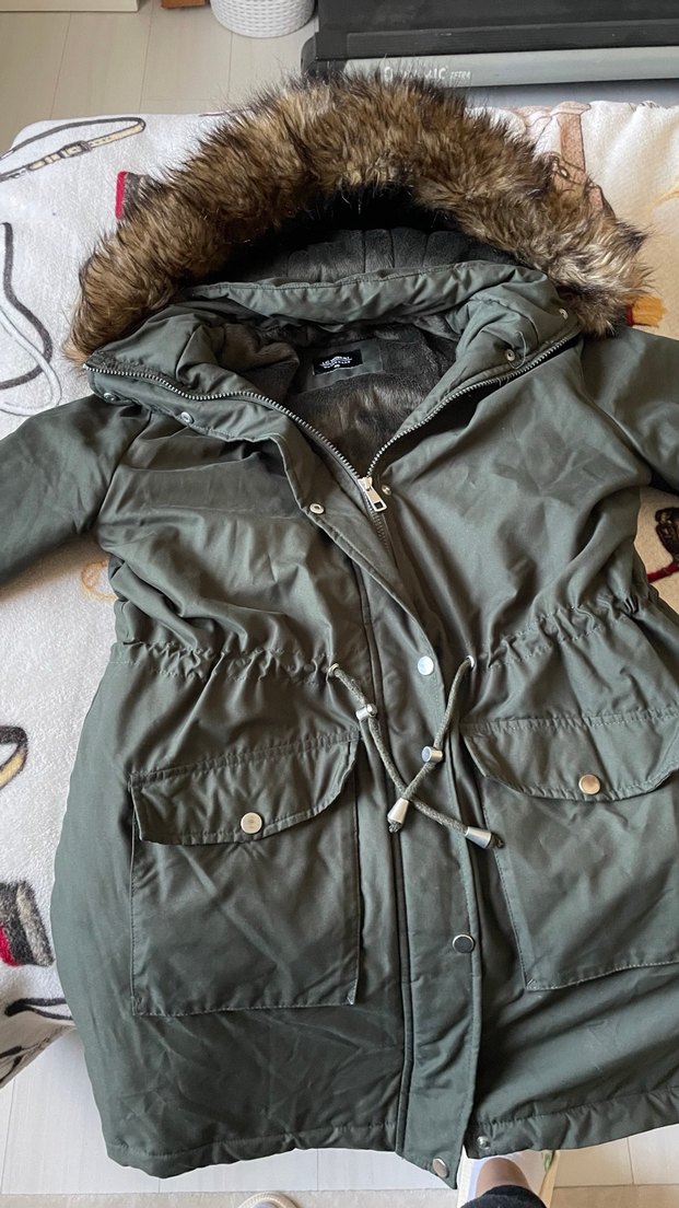 Gri renkli, kürk detaylı kapüşonlu, normal boyda ve fitted kesim kadın kışlık mont. Yumuşak ve sıcak dokulu kumaştan, uzun kollu, sokak tarzı dış giyim ürünü. ❄️