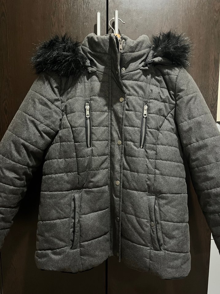 Gri renkte, kürklü detaylı, yumuşak kumaştan yapılmış, normal boy ve standart kalıp kadın kışlık mont. Fermuarlı cepleri vardır. Herhangi bir defosu vs yoktur.