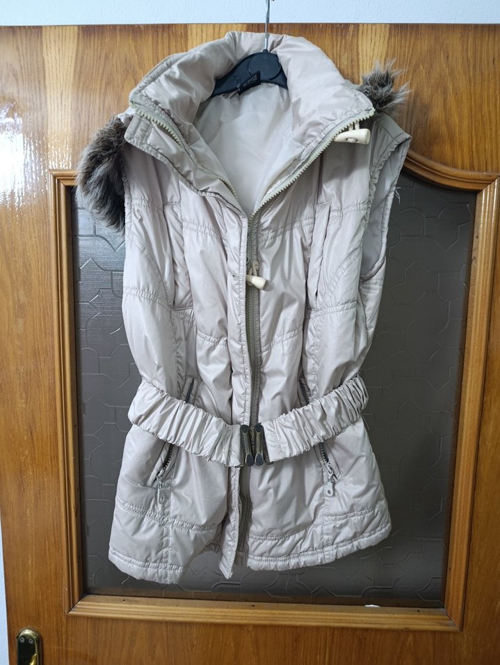 krem renk, kolsuz, yakalı ve kürk detaylı kadın midi yelek. Bel kısmında kemerli, şık ve rahat bir görünüm sunar. Sokak modasına uygun.